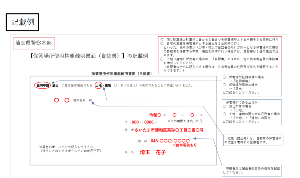 ※保管場所が自分の土地の場合は自認書、他人の土地の場合は土地の所有者の承諾書が権限を有していることを証することの書面
